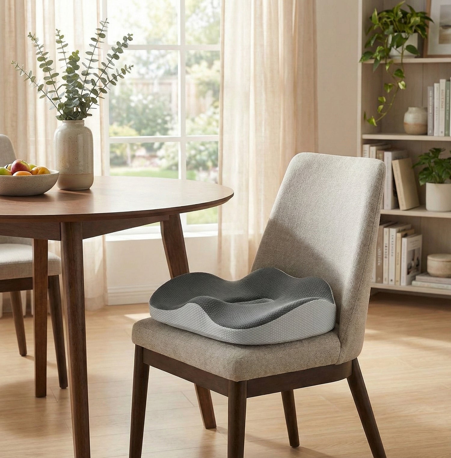 Gillar att den inte glider runt. Skön även på enklare stolar. Malin S.Bekväm och sitter på plats